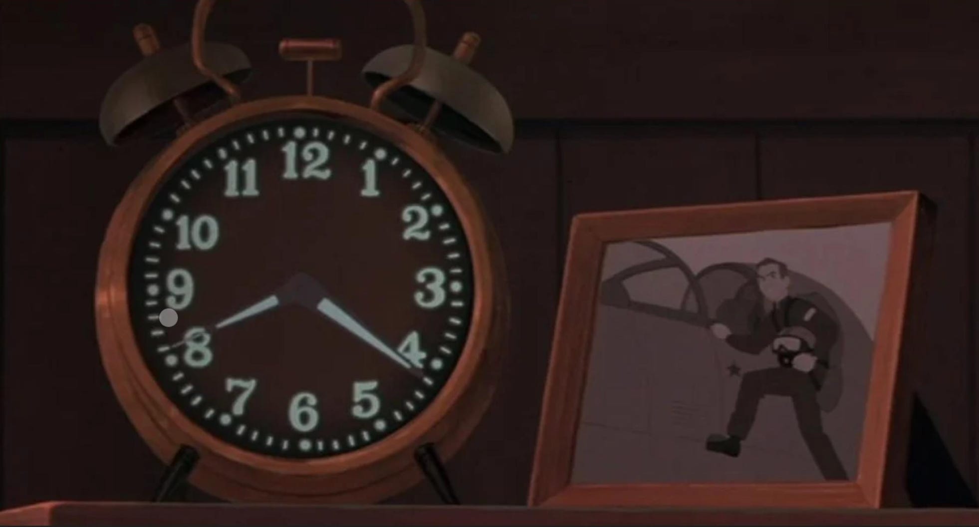 Throughout the film, Hogarth wears an old pilot helmet, and we don’t know the story behind it. He wears it every time he is scared, such as the time he finds the giant robot in the woods. Subconsciously, we know there is something important about this helmet. In a later scene, we see Hogarth wearing the helmet as he sits on his bed. The camera pans to the clock on his nightstand, and right next to the clock is a picture of a fighter pilot getting into a plane. He has the same helmet.