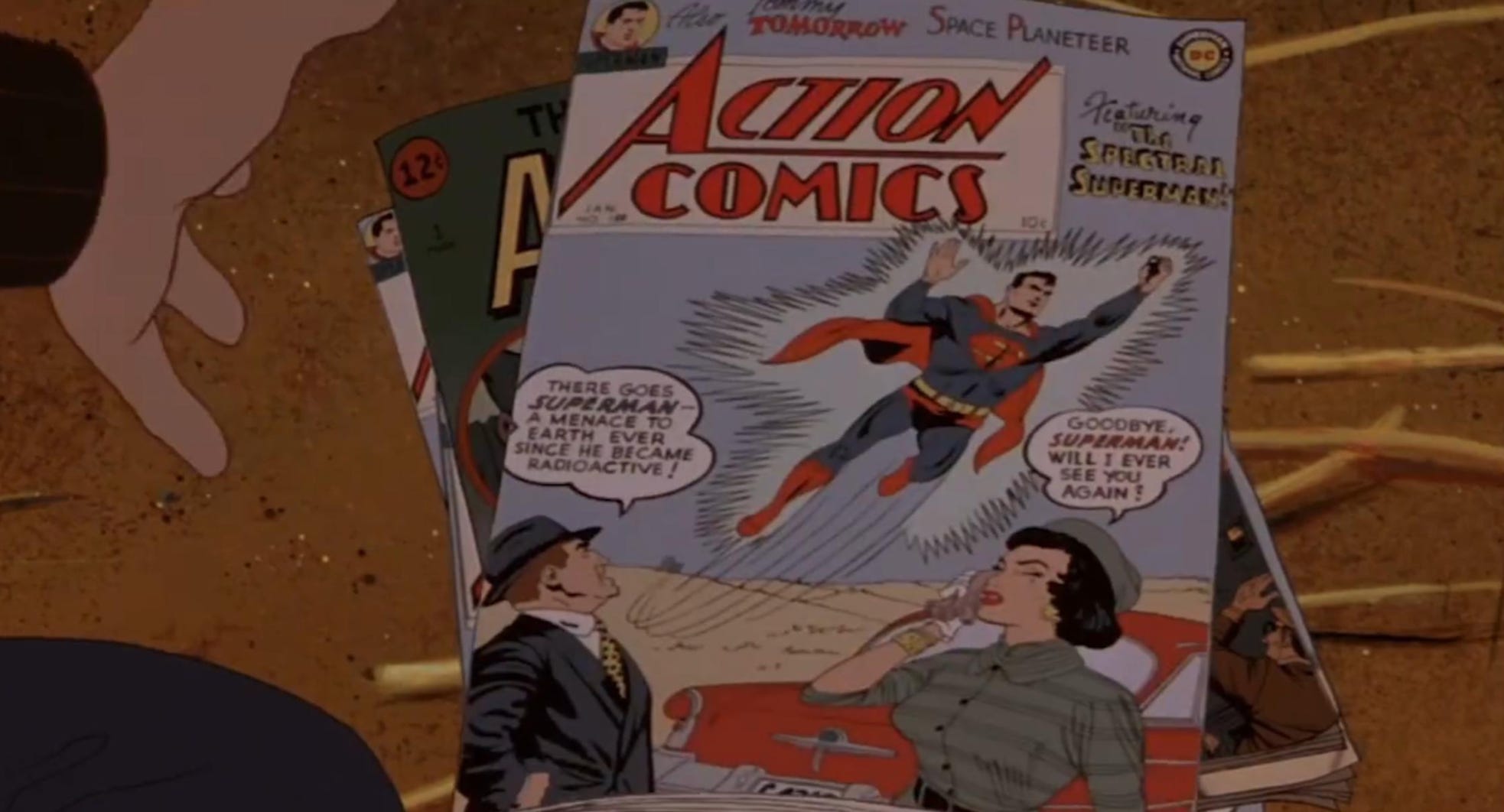 Later, Hogarth brings his comics out to the robot staying in his barn. He first shows him Atomo: The Metal Menace. As viewers, we know nothing about Atomo, but he looks like a typical alien robot invading earth. The metal robot dislikes this, because he remembers that guns kill and Atomo looks like a gun. But then everything changes when we see Hogarth pull out a Superman comic. The boy says, “You’re a good guy...like Superman.” When this happens, the metal robot’s eyes light up and we get no explanation of what Superman does. We simply know he is good. Hogarth doesn't even say Superman saves people instead of killing them like Atomo, because we all know the American Myth that is Superman, the hero that is simply good and saves people. Even if it is a fantasy, we imagine in our worst moments, when the house is in flames and caving in on us, Superman will be there.